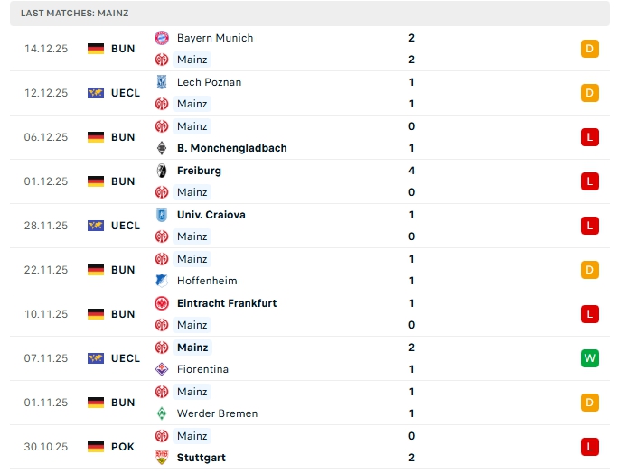 Mainz sau 14 vòng đấu đầu tiên, hàng công của đội bóng này mang về 13 bàn thắng cùng hàng thủ nhận 26 bàn thua, hàng thủ đang chơi tệ khiến Mainz đang gặp nhiều khó khăn, 3/5 trận gần nhất của Mainz khép lại không quá 2 bàn thắng, trên sân nhà ở 4/5 trận vừa qua khép lại không quá 2 bàn.