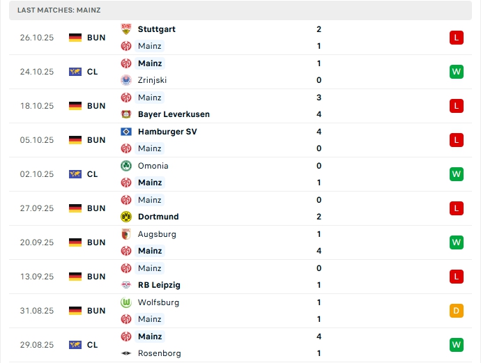 Mainz sau 8 trận đấu, đội bóng này mang về 1 chiến thắng, 1 hòa cùng 6 thất bại, có được 4 điểm và đang xếp vị trí thứ 16 trên BXH, một vị trí trong nhóm cầm đèn đỏ, phong độ thời gian qua của Mainz là không tốt, ở vòng gần nhất họ nhận thất bại đậm 1-2 trước Stutgart, Mainz chỉ thắng 1 ở 4 trận gần nhất với 3 thất bại, trên sân nhà Mainz cũng đang chơi tệ với 2 chiến thắng cùng 3 thất bại sau 5 trận.