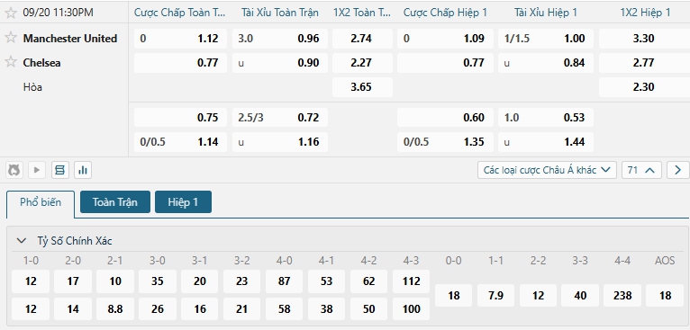 Kèo tỷ số trận Man Utd vs Chelsea