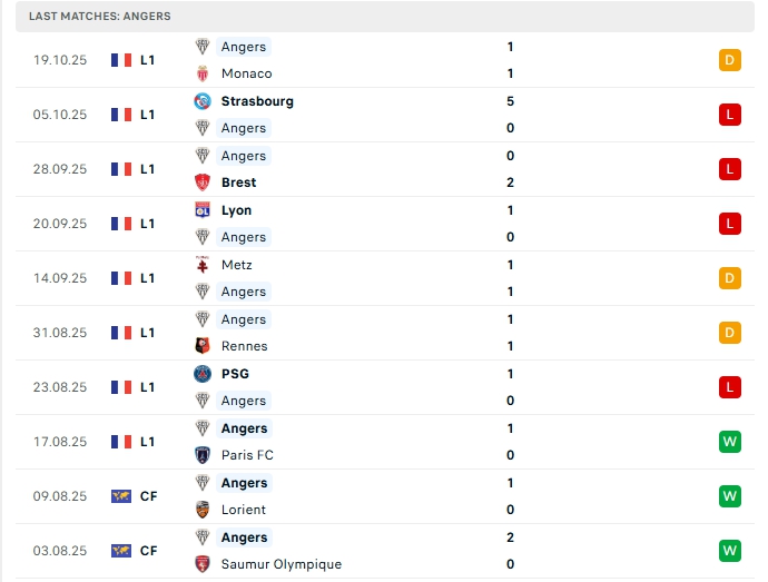 Angers sau 9 vòng đấu, hàng công đội bóng này mang về chỉ 4 bàn thắng, dù vậy hàng thủ đang lộ nhiều khoảng trống khi để đối thủ chọc thủng lưới đến 12 lần, 4/5 trận vừa qua của Angers đều để các đối thủ chọc thủng lưới và 4/5 trận xa nhà cũng tương tự.