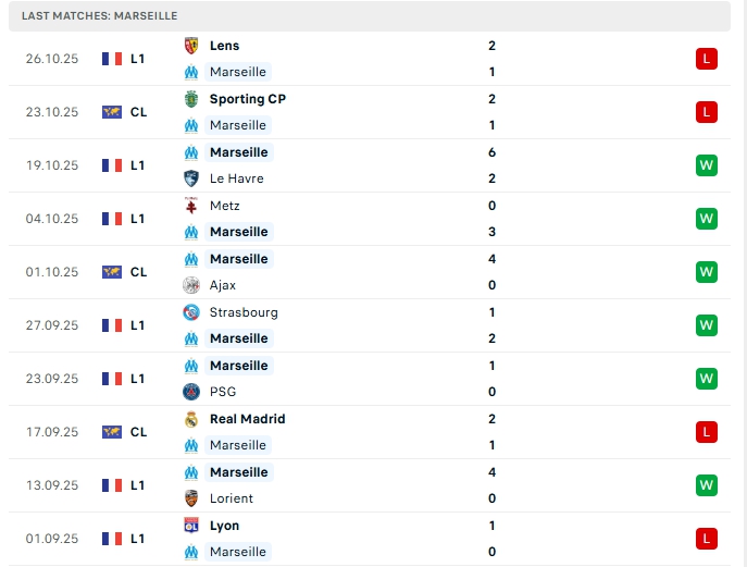 Marseille sau 9 vòng đấu, đội bóng này có được 6 chiến thắng cùng 3 thất bại, có được 18 điểm và đang xếp vị trí thứ 3 trên BXH, ở trận gần nhất Marseille nhận thất bại 1-2 trước Lens, đây là trận thua thứ 2 liên tiếp của đội bóng này, dù vậy trên sân nhà Marseille đang được đánh giá cao với chuỗi 13 trận bất bại, trong đó có 12 chiến thắng.