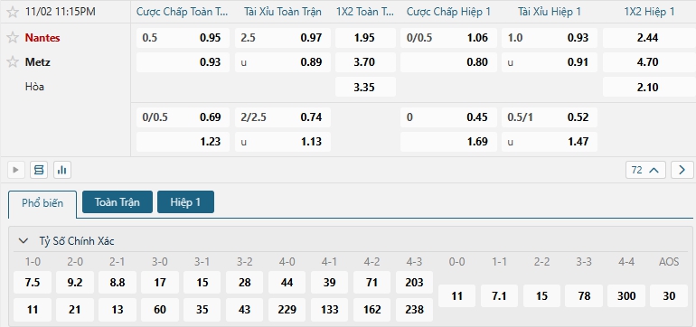 Bảng tỷ lệ kèo bóng đá trận đấu Nantes vs Metz