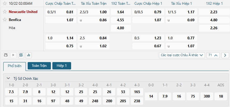 Bảng tỷ lệ kèo bóng đá trận đấu Newcastle vs Benfica