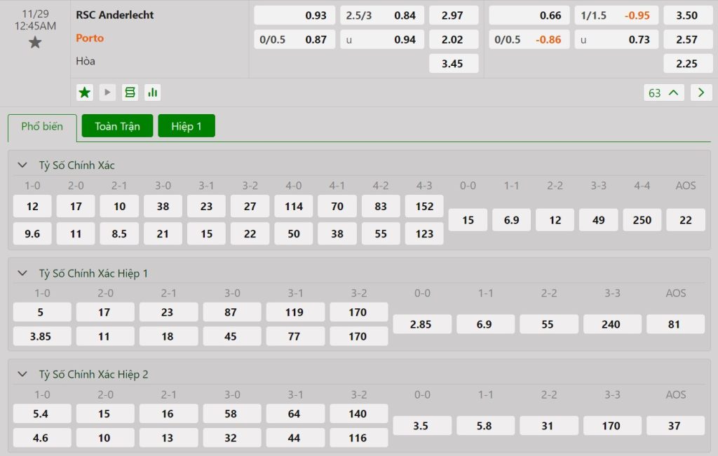 Bảng cập nhật tỷ lệ kèo nhà cái trận Anderlecht vs Porto