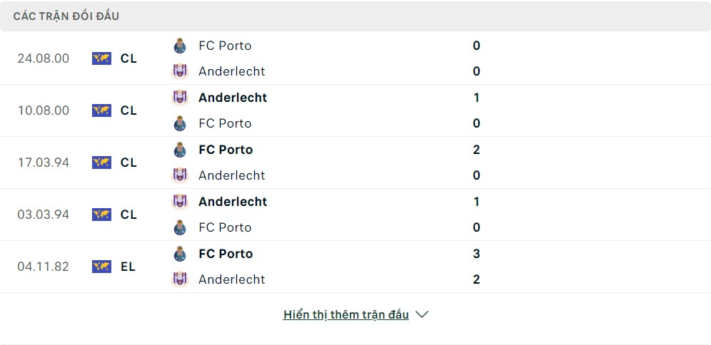 - Anderlecht 2 – 2 Porto (Cả trận)