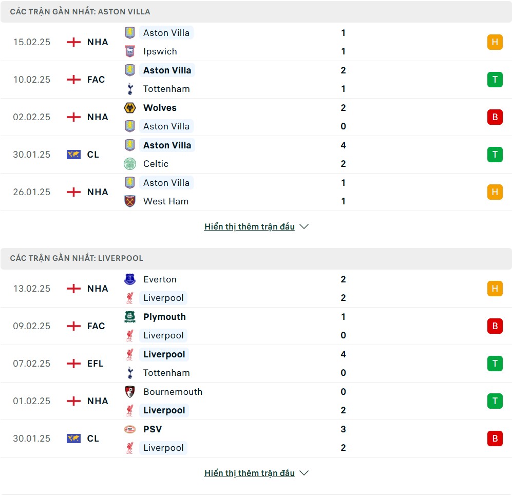 Thống kê phong độ gần đây & thành tích đối đầu Aston Villa vs Liverpool