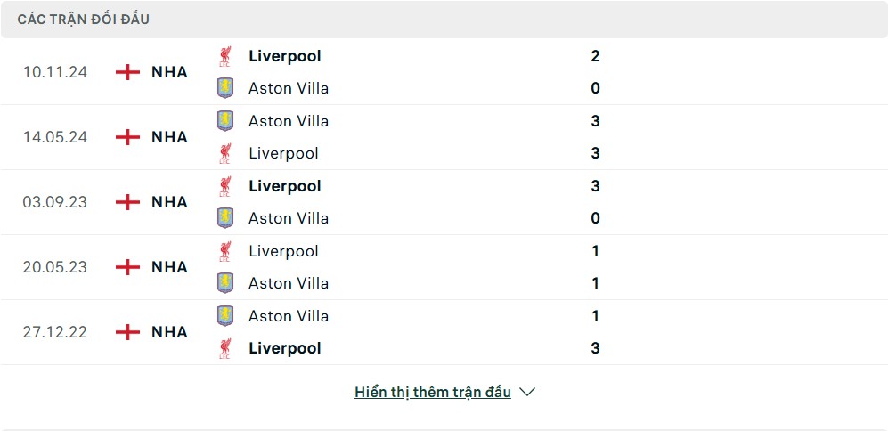 Lịch sử tất nhiên không dành cho kẻ yếu, ở đây là Aston Villa. Thống kê ở 10 lần gặp nhau gần nhất cho thấy sự áp đảo hoàn toàn của Liverpool khi đại diện Merseyside có 7 chiến thắng, hai đội hòa nhau 2 lần và The Villans có đúng 1 lần ca khúc khải hoàn. 5 lần gần nhất được đá tại sào huyệt Villa Park, đội bóng thành Birmingham cũng chỉ có đúng 1 chiến thắng, 1 trận hòa cùng 3 thất bại.