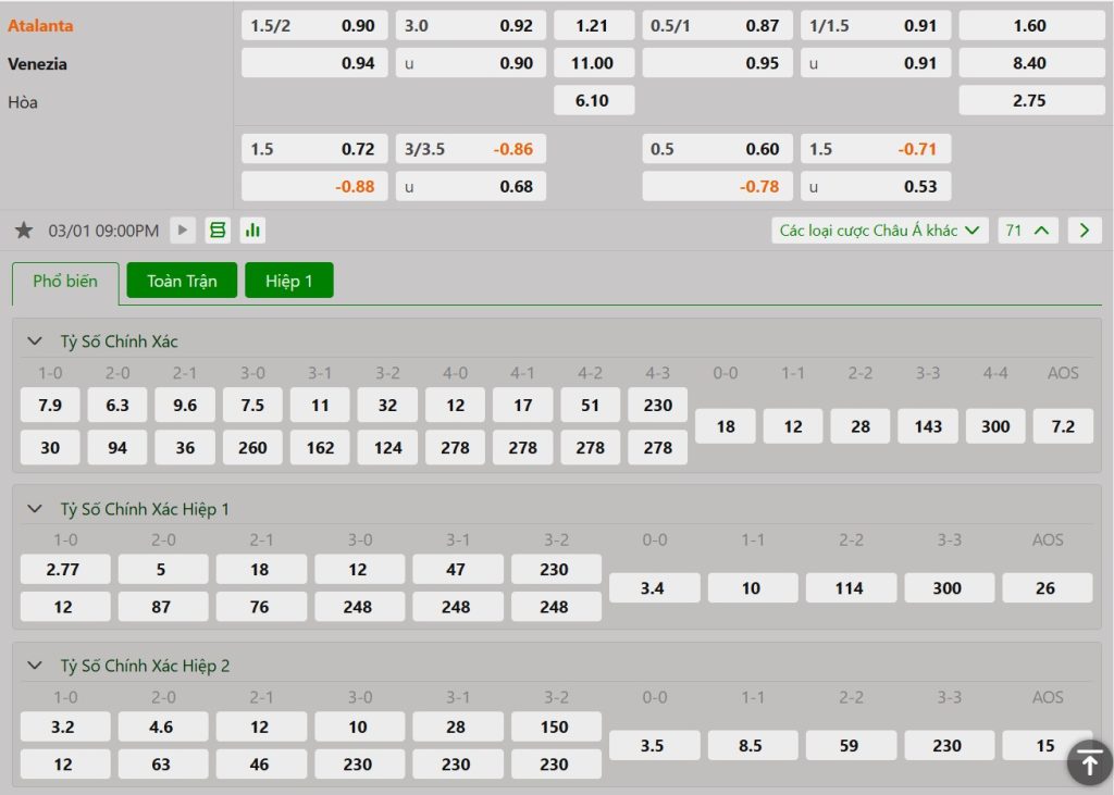 Bảng cập nhật tỷ lệ kèo nhà cái trận Atalanta vs Venezia