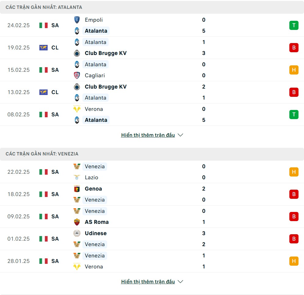 Thống kê phong độ gần đây & thành tích đối đầu Atalanta vs Venezia