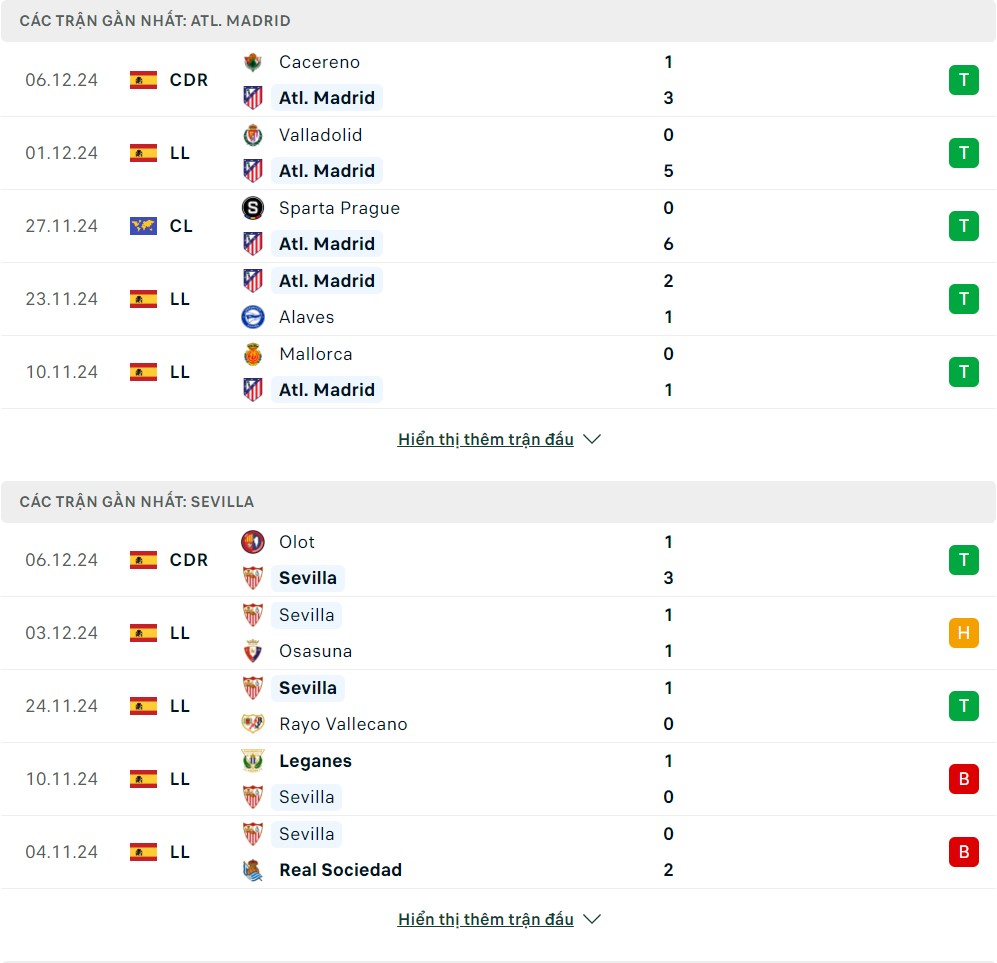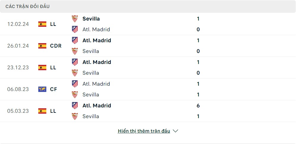Thống kê phong độ gần đây & thành tích đối đầu Atletico Madrid vs Sevilla