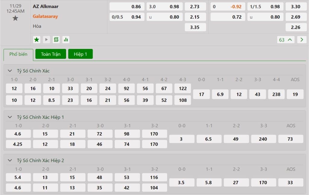 Tỷ lệ kèo châu Âu đánh giá cao khả năng giành chiến thắng của Galatasaray. Tuy nhiên AZ Alkmaar đang có tâm lý tốt lại được chơi trên sân nhà. Kết quả hòa là hoàn toàn xứng đáng cho những nỗ lực của thầy trò Maarten Martens.