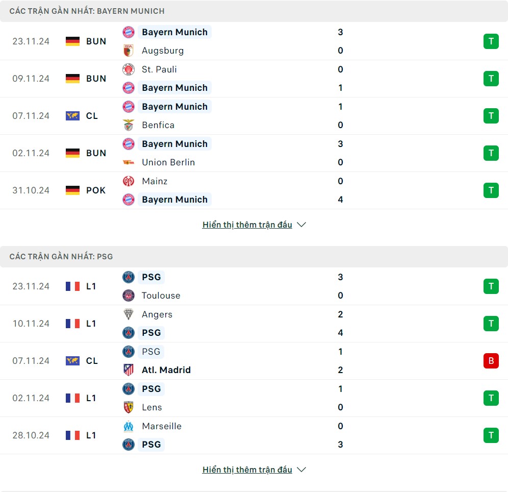 Thống kê phong độ gần đây & thành tích đối đầu Bayern Munich vs Paris Saint Germain