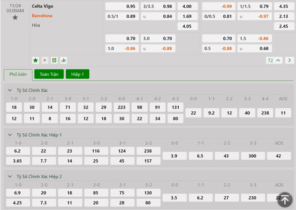 Bảng cập nhật tỷ lệ kèo nhà cái trận Celta Vigo vs Barcelona