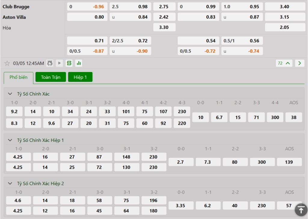 Bảng cập nhật tỷ lệ kèo nhà cái trận Club Brugge vs Aston Villa