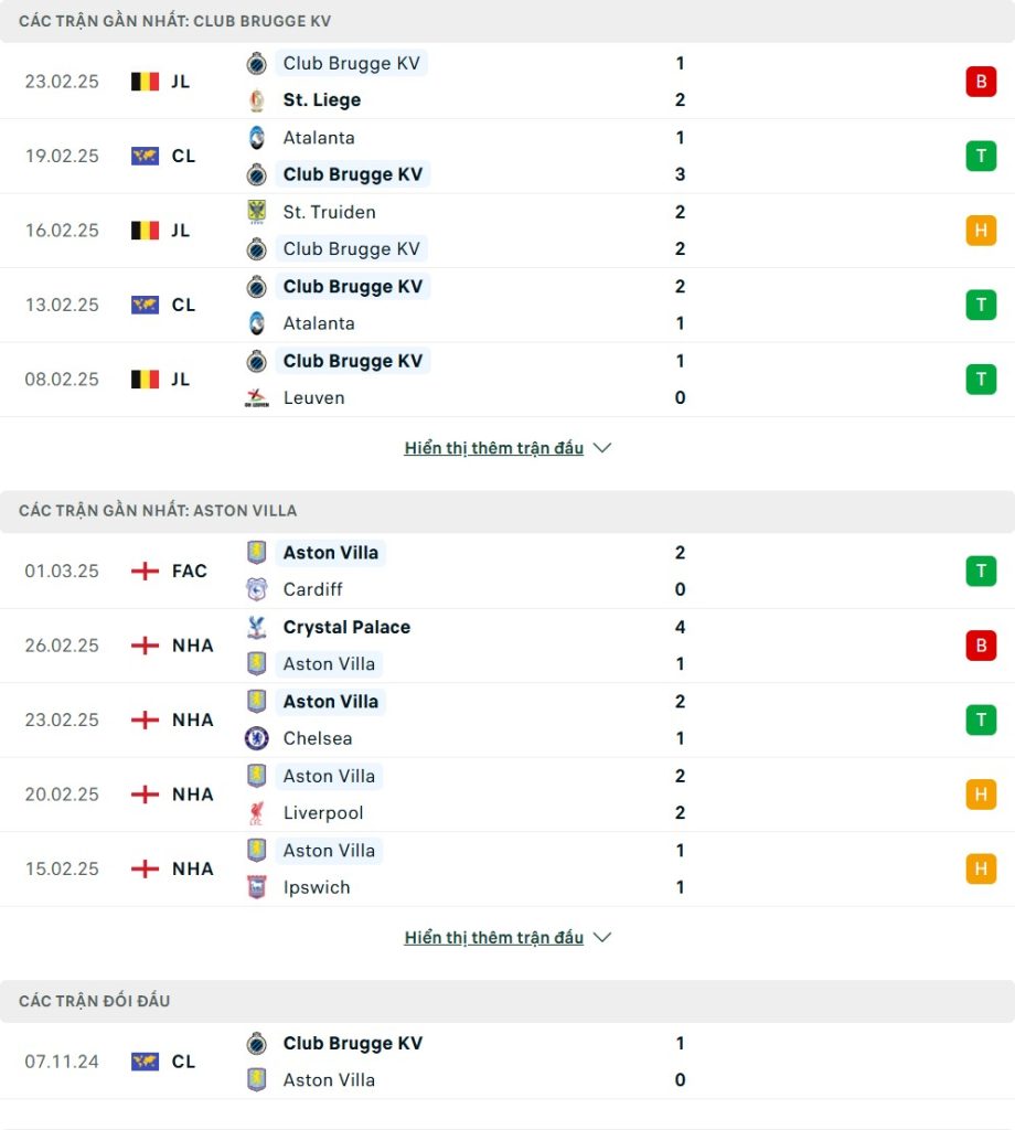 Thống kê phong độ gần đây & thành tích đối đầu Club Brugge vs Aston Villa