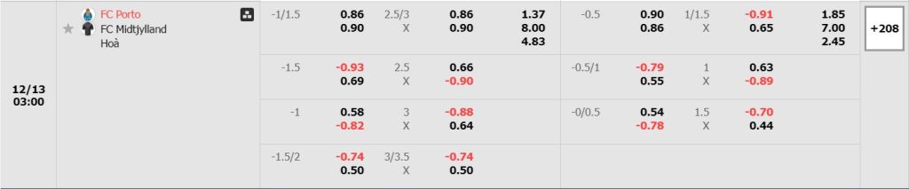 Bảng cập nhật tỷ lệ kèo nhà cái trận FC Porto vs Midtjylland