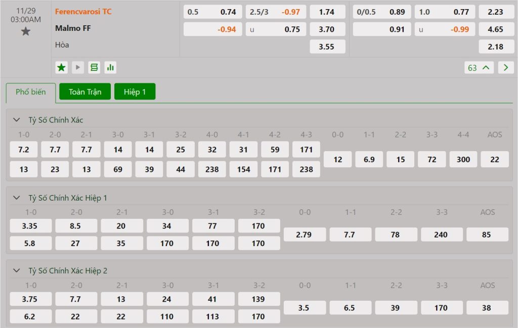 Bảng cập nhật tỷ lệ kèo nhà cái trận Ferencvaros vs Malmo FF
