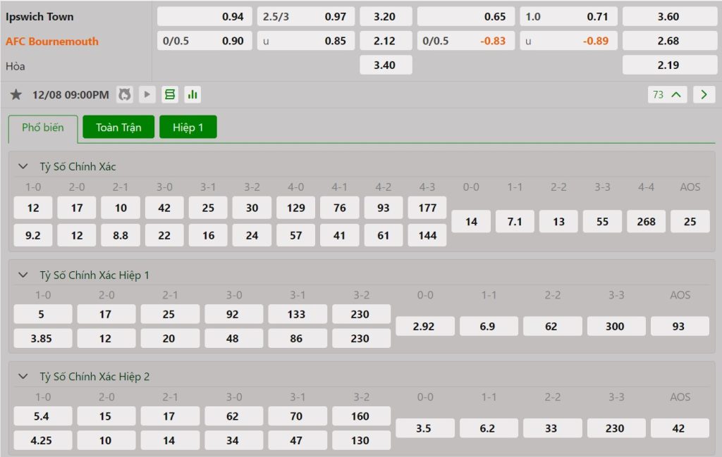 Tỷ lệ kèo châu Âu đánh giá cao khả năng giành chiến thắng của Bournemouth. Tuy nhiên Ipswich đang có tâm lý tốt lại được chơi trên sân nhà trong khi cán cân đối đầu cũng cho thấy sự cân bằng. Kết quả hòa là hoàn toàn xứng đáng cho những nỗ lực của thầy trò Kierran McKenna.