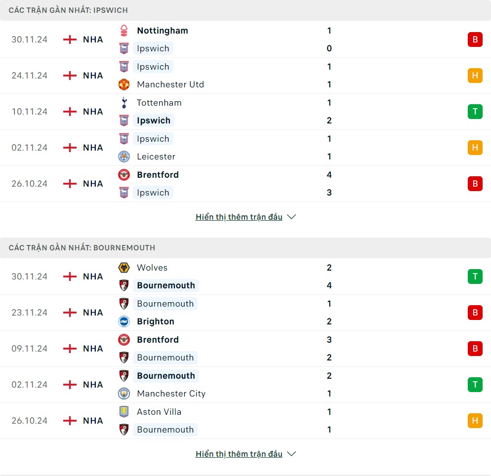 Thống kê phong độ gần đây & thành tích đối đầu Ipswich vs Bournemouth