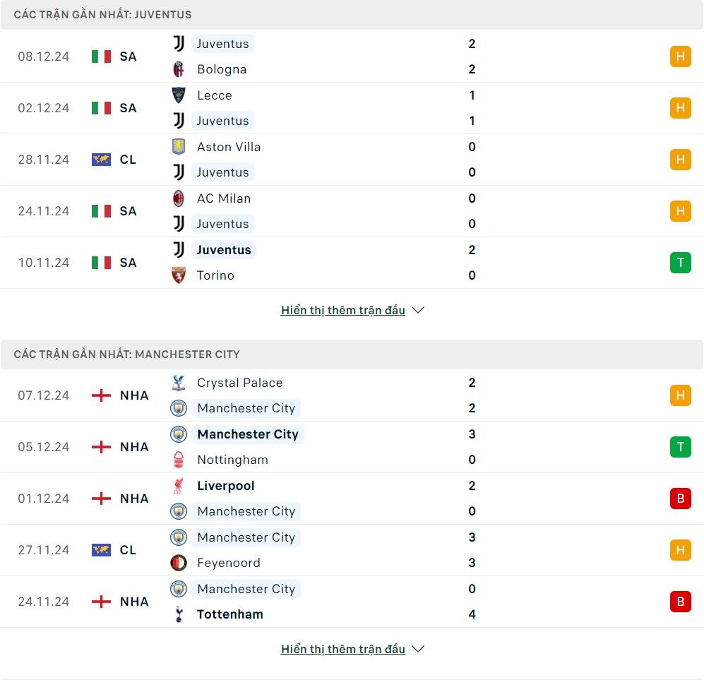 Thống kê phong độ gần đây & thành tích đối đầu Juventus vs Manchester City
