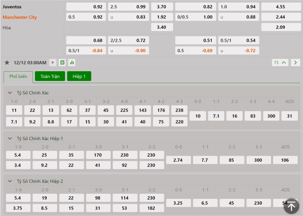 Bảng cập nhật tỷ lệ kèo nhà cái trận Juventus vs Manchester City
