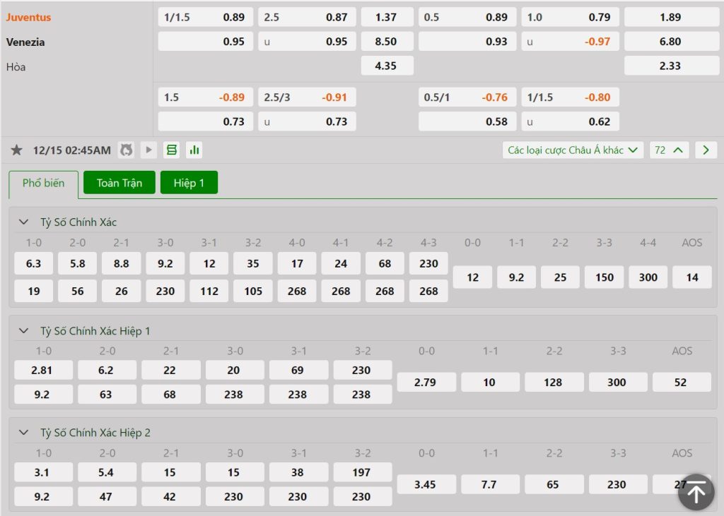 Bảng cập nhật tỷ lệ kèo nhà cái trận Juventus vs Venezia