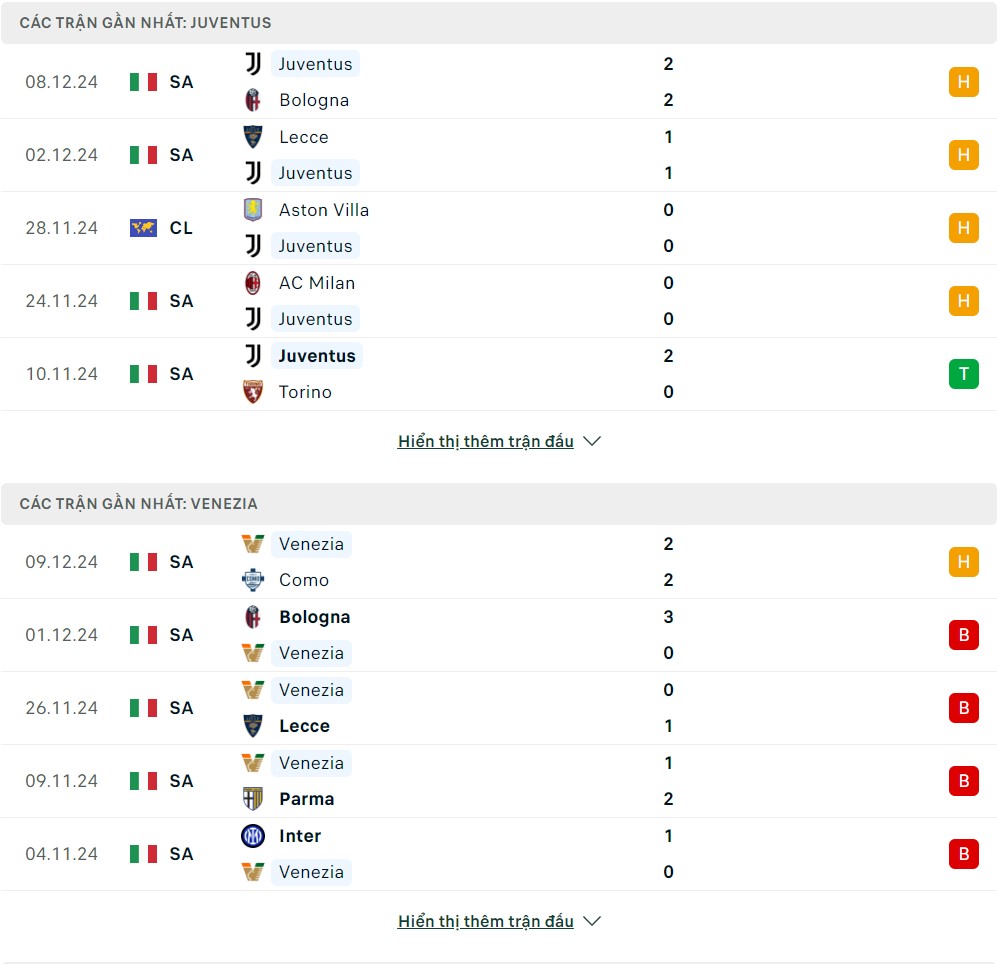 Thống kê phong độ gần đây & thành tích đối đầu Juventus vs Venezia