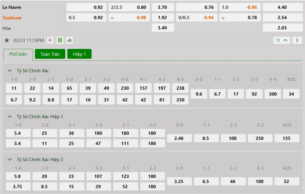 Bảng cập nhật tỷ lệ kèo nhà cái trận Le Havre vs Toulouse
