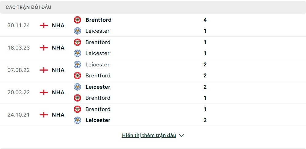 Thống kê phong độ gần đây & thành tích đối đầu Leicester City vs Brentford