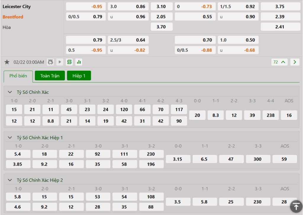 Bảng cập nhật tỷ lệ kèo nhà cái trận Leicester City vs Brentford