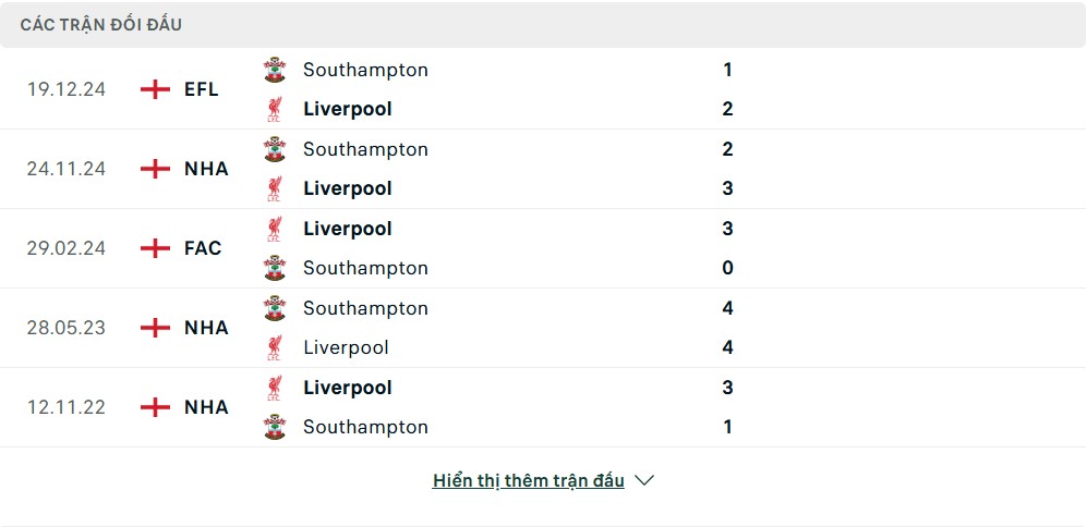 Thống kê phong độ gần đây & thành tích đối đầu Liverpool vs Southampton