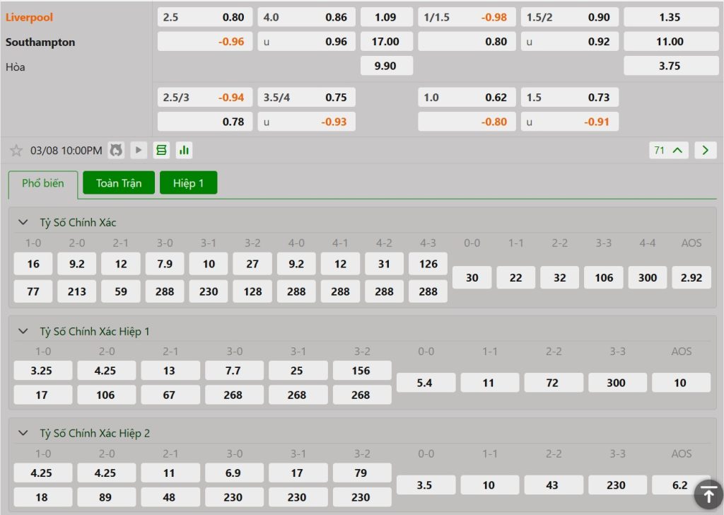 Bảng cập nhật tỷ lệ kèo nhà cái trận Liverpool vs Southampton