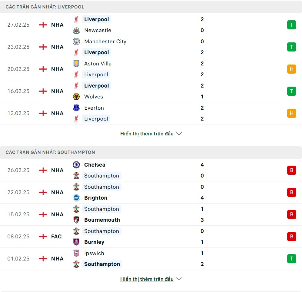 Thống kê phong độ gần đây & thành tích đối đầu Liverpool vs Southampton