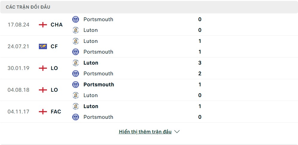 Được chơi trên sân nhà nhưng Luton Town không nhận được sự ủng hộ từ lịch sử. Thống kê ở 10 lần gặp nhau gần nhất cho thấy sự vượt trội của Portsmouth khi đội bóng vừa giành quyền thăng hạng sau chiến dịch 2023/24 có 5 chiến thắng, hai đội hòa nhau 3 lần trong khi Luton Town chỉ có 2 lần ca khúc khải hoàn. 4 trận đấu thuộc khuôn khổ giải đấu chính thức gần nhất được chơi tại Kenilworth Road, Luton Town cũng chỉ thắng 2 và thua 2.