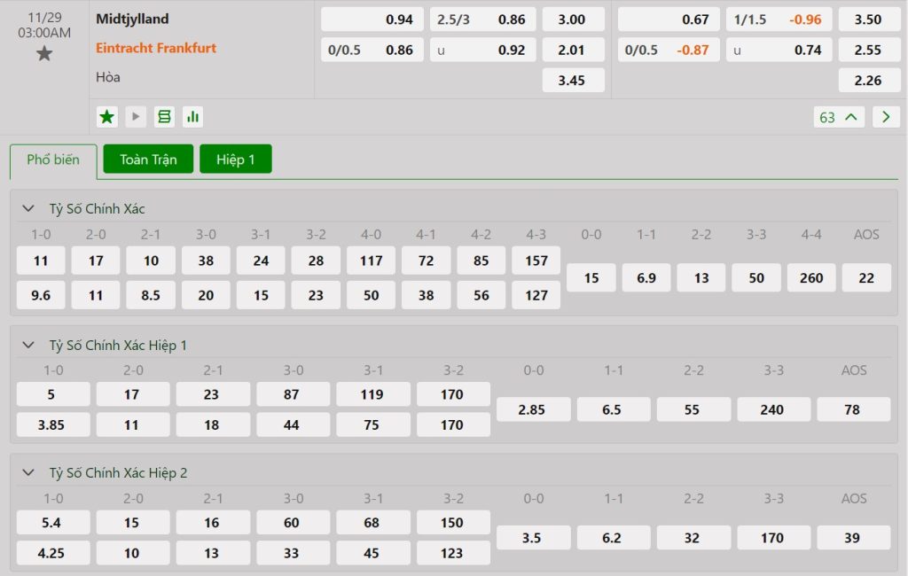 Soi kèo hiệp 1 trận Midtjylland vs Eintracht Frankfurt
