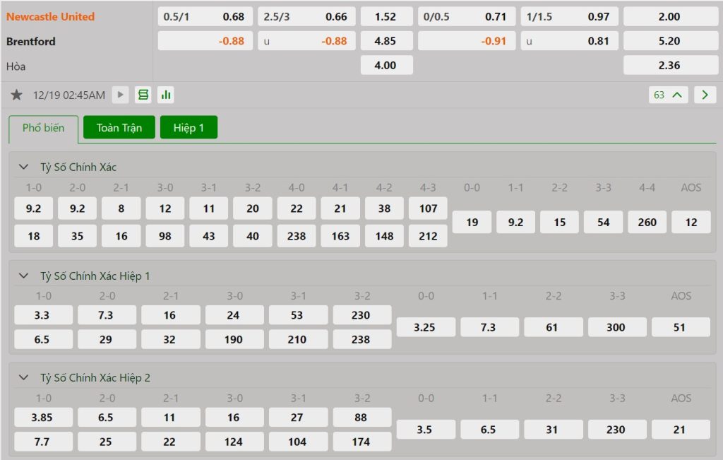 Bảng cập nhật tỷ lệ kèo nhà cái trận Newcastle vs Brentford