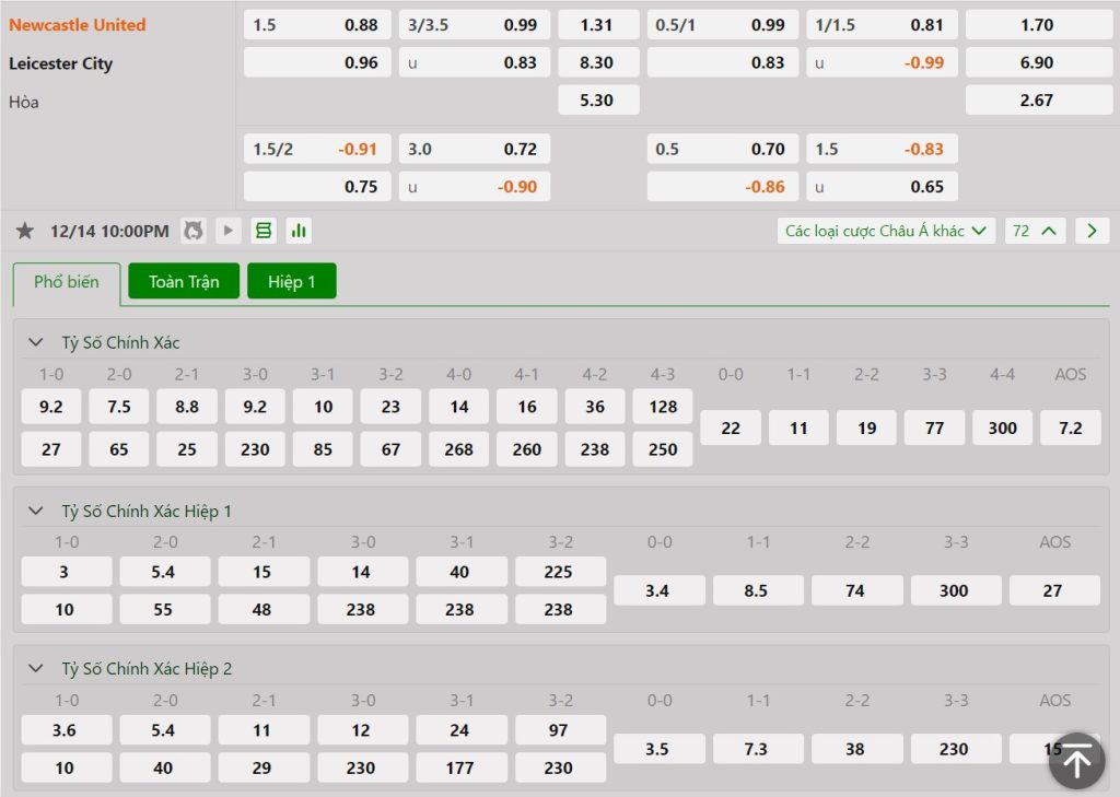 Bảng cập nhật tỷ lệ kèo nhà cái trận Newcastle vs Leicester City