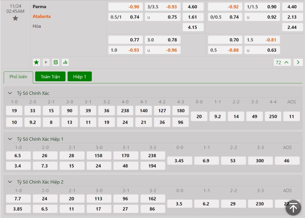Bảng cập nhật tỷ lệ kèo nhà cái trận Parma vs Atalanta