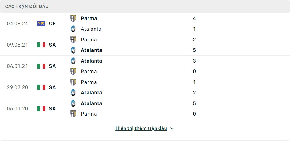 Được chơi trên sân nhà nhưng Parma không nhận được sự ủng hộ từ lịch sử. Thống kê ở 10 lần gặp nhau gần nhất cho thấy sự áp đảo hoàn toàn của Atalanta khi đại diện xứ Bergamo có tới 7 chiến thắng, hai đội hòa nhau 1 lần và tân binh của Serie A 2024/25 có 2 lần ca khúc khải hoàn. Chiến thắng 4-1 ở giai đoạn Pre-season mùa giải năm nay rõ ràng cũng không có nhiều ý nghĩa với đội quân của HLV Fabio Pacchia bởi suy cho cùng, đó cũng chỉ là 1 trận đấu vô thưởng, vô phạt.