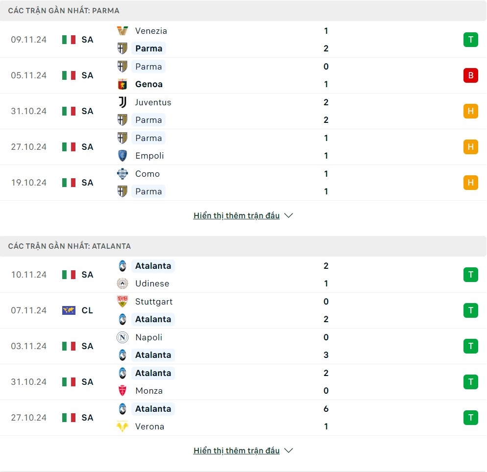 Thống kê phong độ gần đây & thành tích đối đầu Parma vs Atalanta