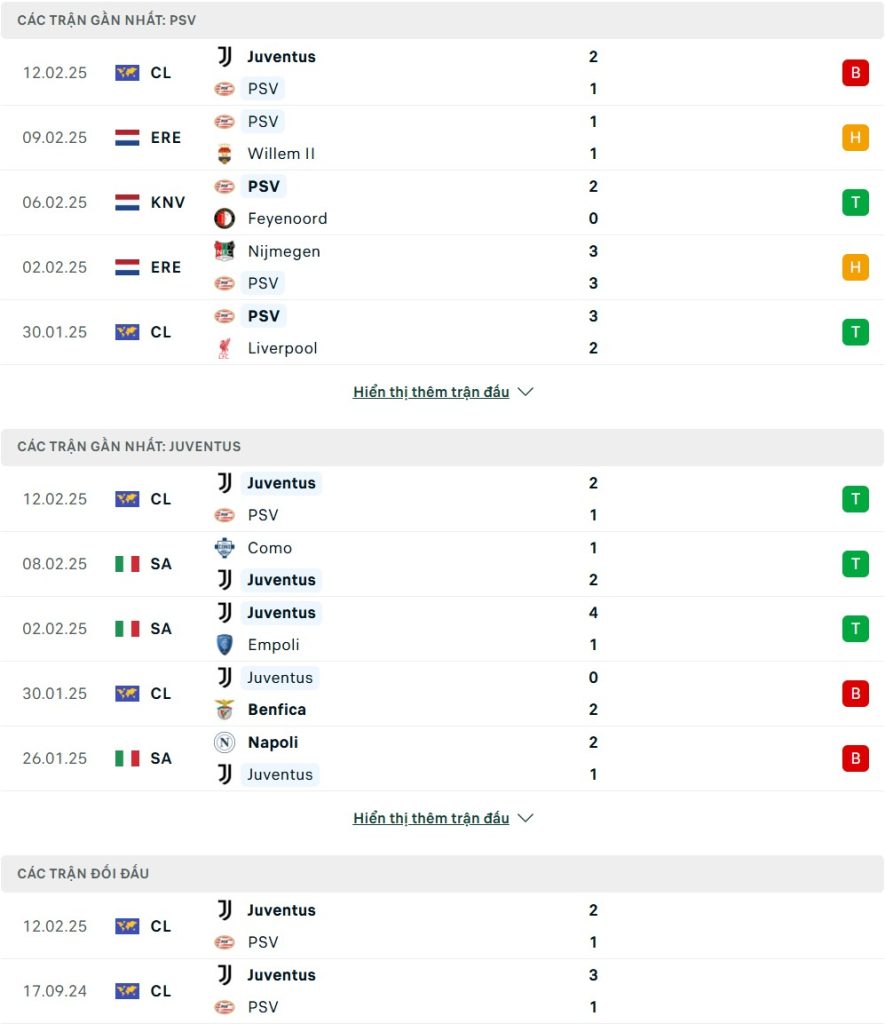 Thống kê phong độ gần đây & thành tích đối đầu PSV Eindhoven vs Juventus