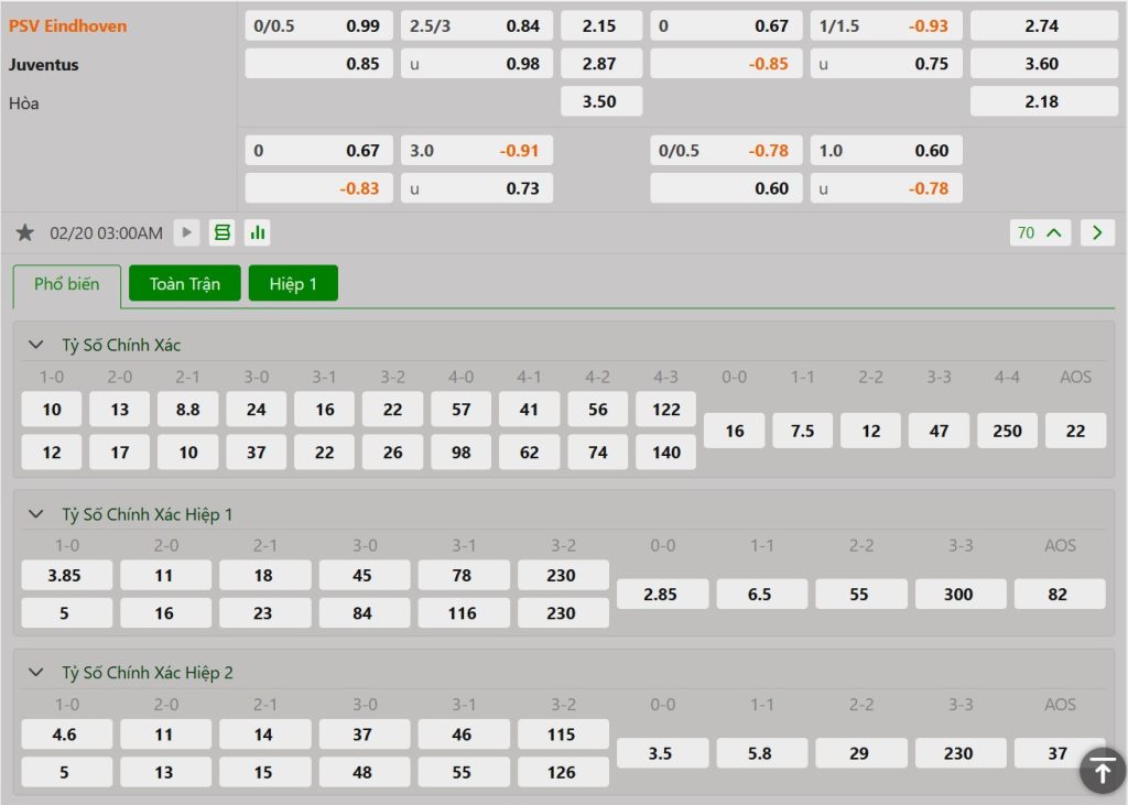Bảng cập nhật tỷ lệ kèo nhà cái trận PSV Eindhoven vs Juventus