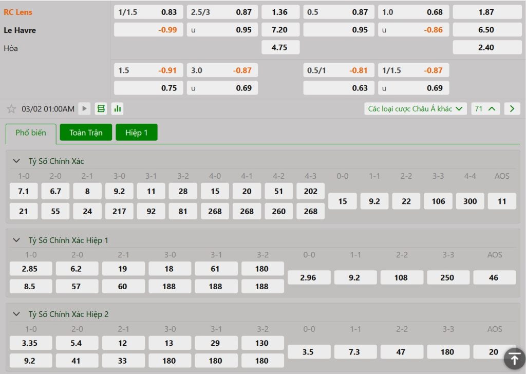 Tỷ lệ kèo châu Âu cho thấy nhà cái đánh giá cao chủ nhà có được chiến thắng. Phong độ không quá vượt trội nhưng lợi thế sân nhà cùng đẳng cấp của đội ở cửa trên, rất khó để RC Lens đánh rơi 3 điểm. Đặc biệt khi nhìn vào màn trình diễn nghèo nàn của Le Havre từ đầu mùa.