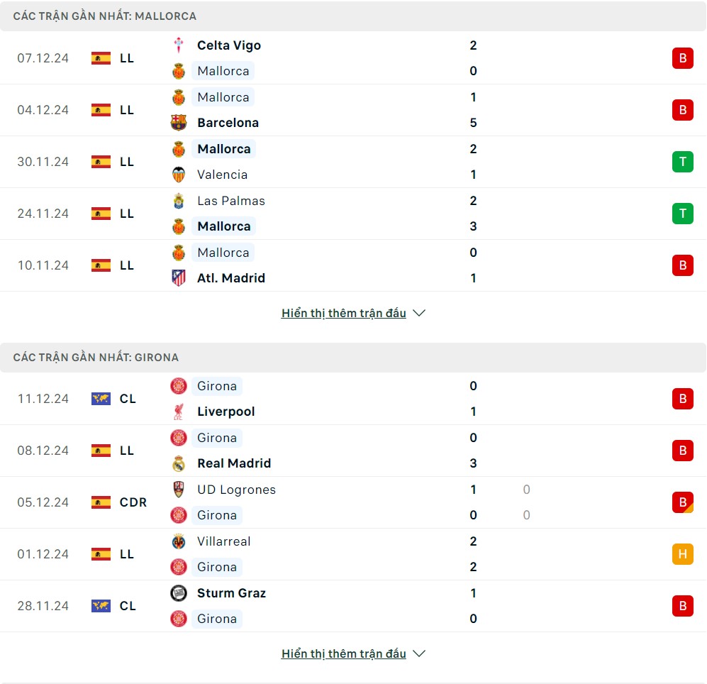 - RCD Mallorca 0 – 0 Girona (Hiệp 1)