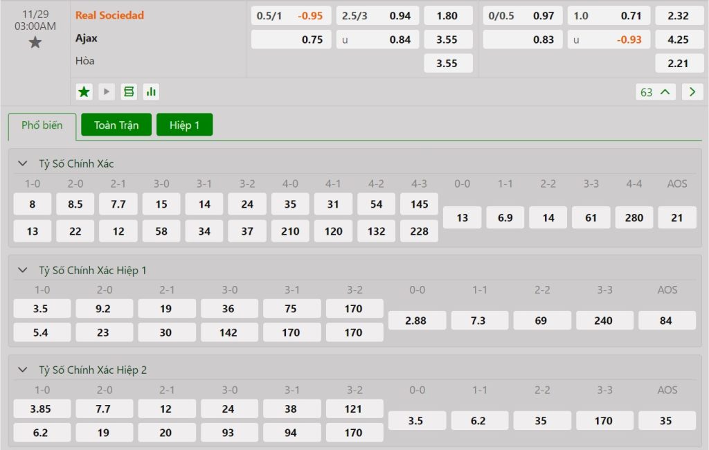 Bảng cập nhật tỷ lệ kèo nhà cái trận Real Sociedad vs Ajax