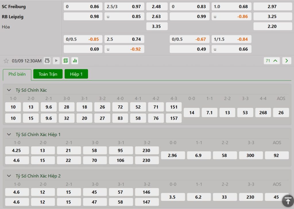 Bảng cập nhật tỷ lệ kèo nhà cái trận SC Freiburg vs RB Leipzig