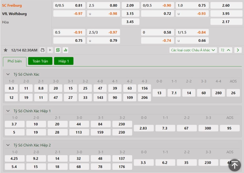 Bảng cập nhật tỷ lệ kèo nhà cái trận SC Freiburg vs VfL Wolfsburg