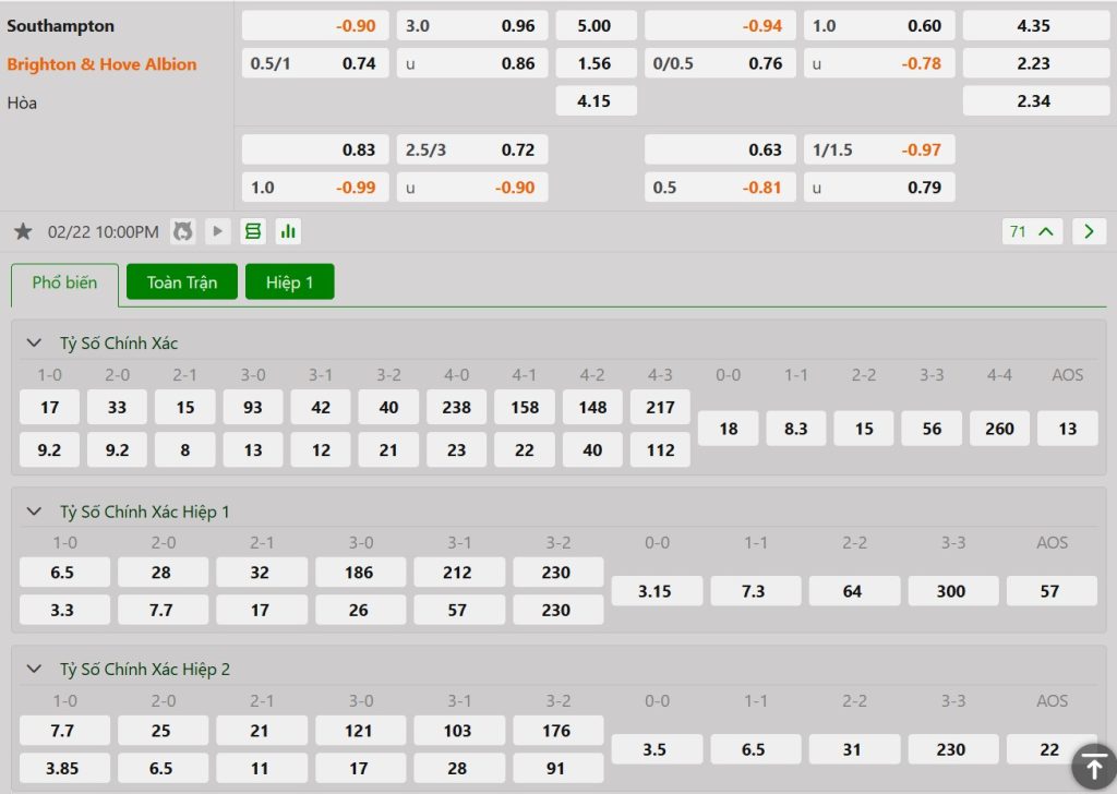 Bảng cập nhật tỷ lệ kèo nhà cái trận Southampton vs Brighton