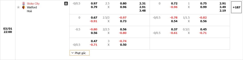 Bảng cập nhật tỷ lệ kèo nhà cái trận Stoke City vs Watford