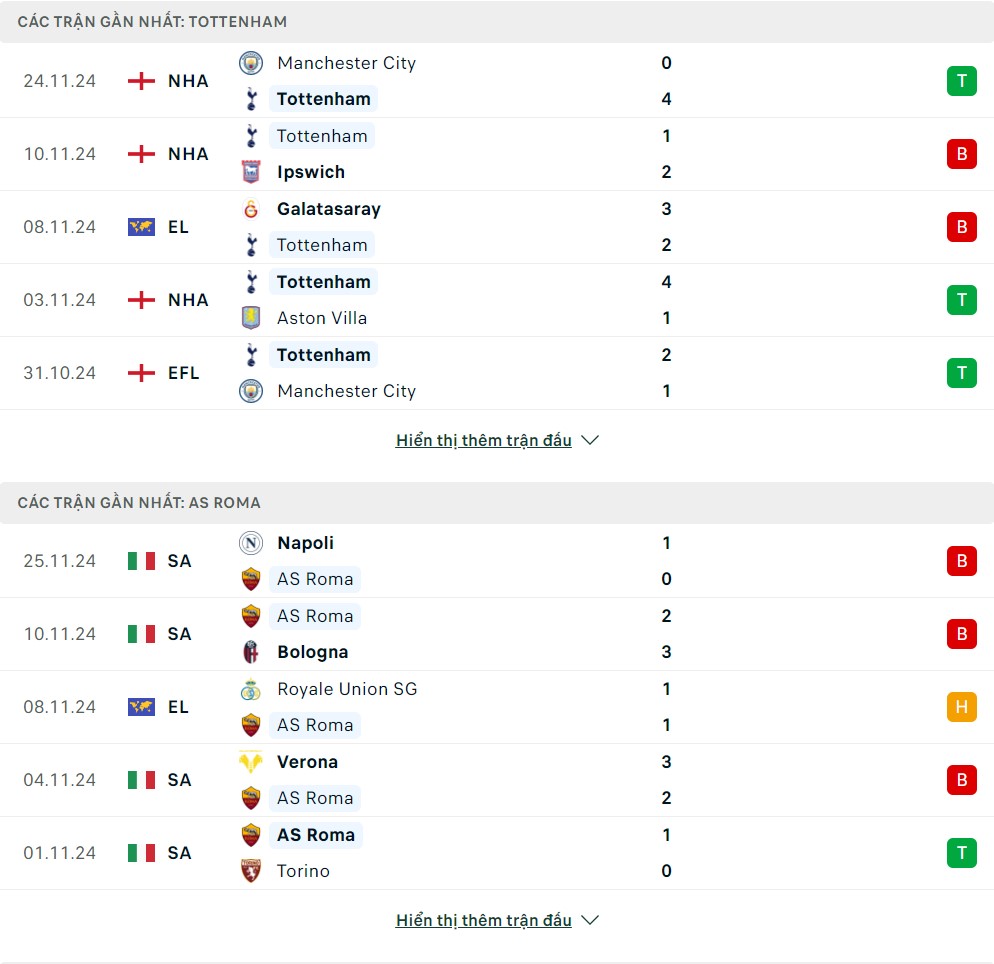 Thống kê phong độ gần đây & thành tích đối đầu Tottenham vs AS Roma